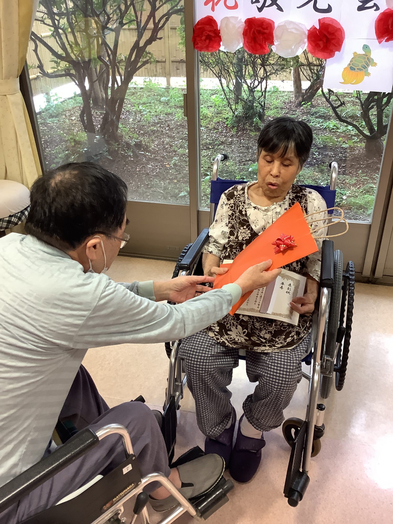 施設からは賞状とお祝いの品をプレゼントさせて頂き