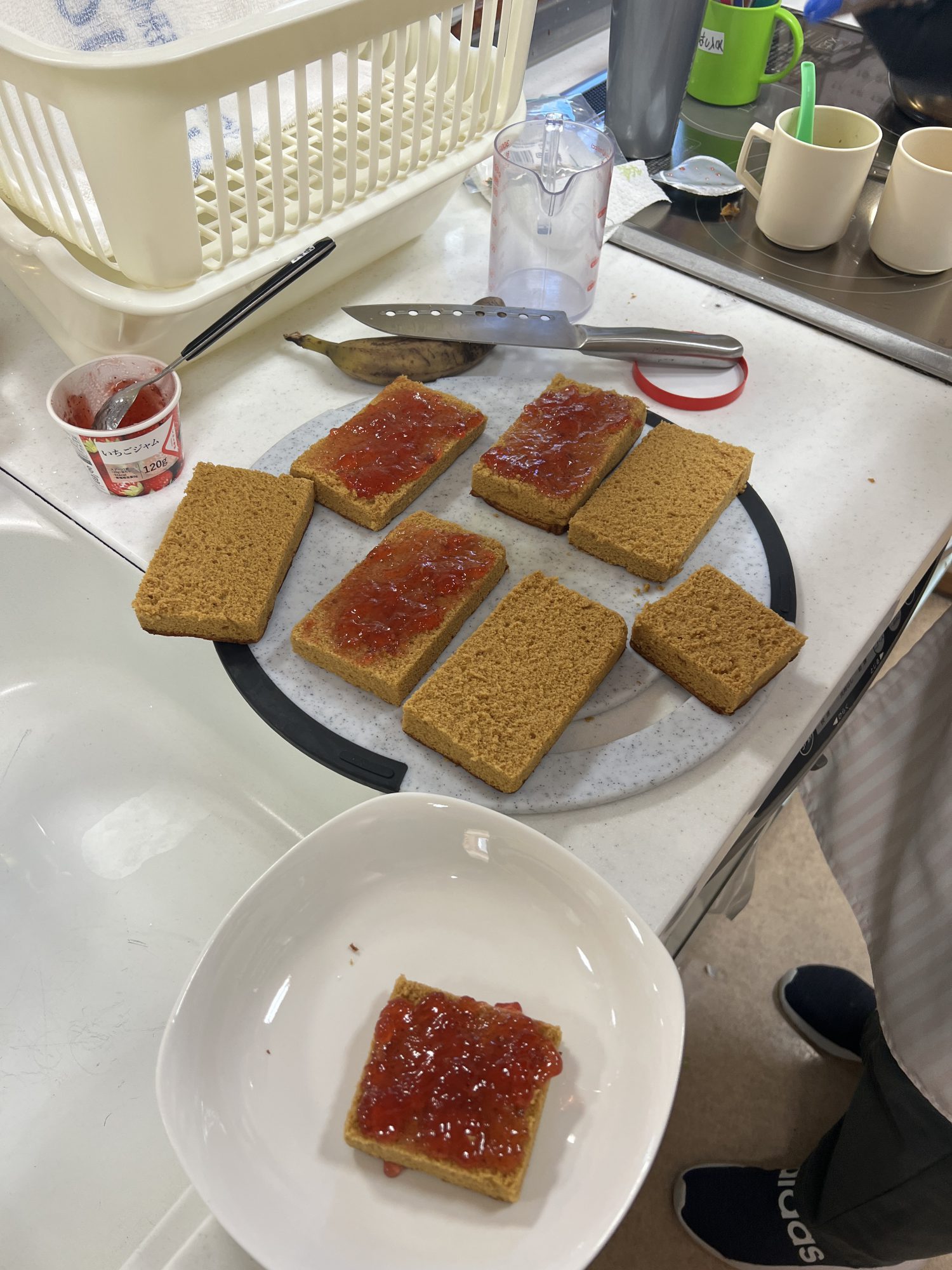 おやつは黒糖スポンジ(カステラ)にジャム、チョコ生クリーム、バナナをサンドし