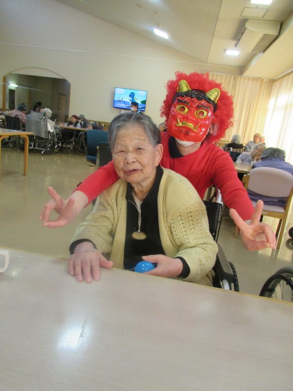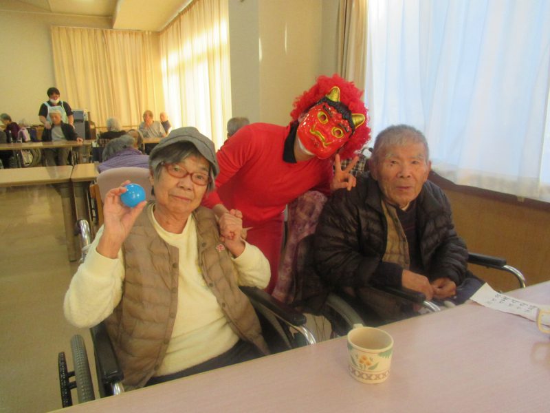 職員の方々が本格的な赤鬼と青鬼に扮して登場すると、利用者皆さん笑いと驚きの声に包まれました。