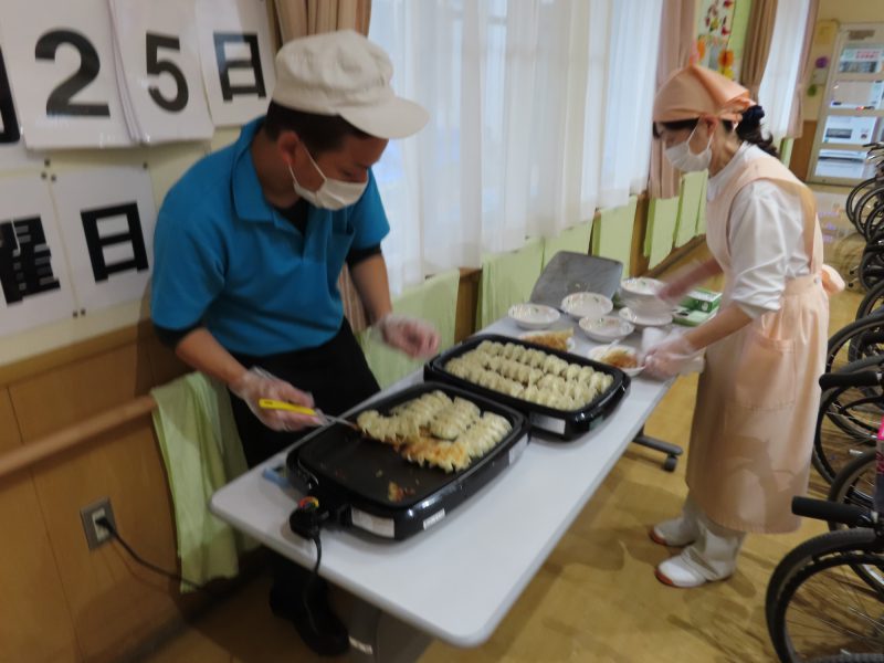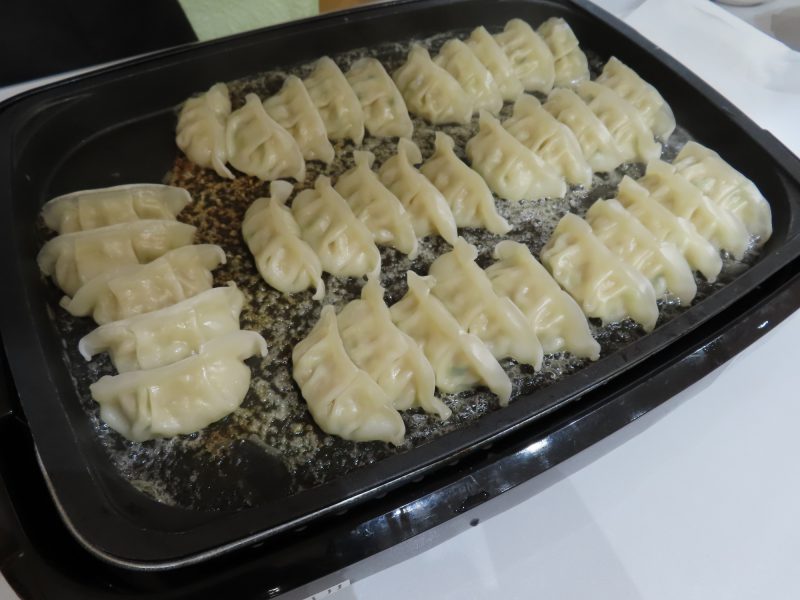 厨房の職員が皆様の前でホットプレートを使い沢山の餃子を焼きました🔥